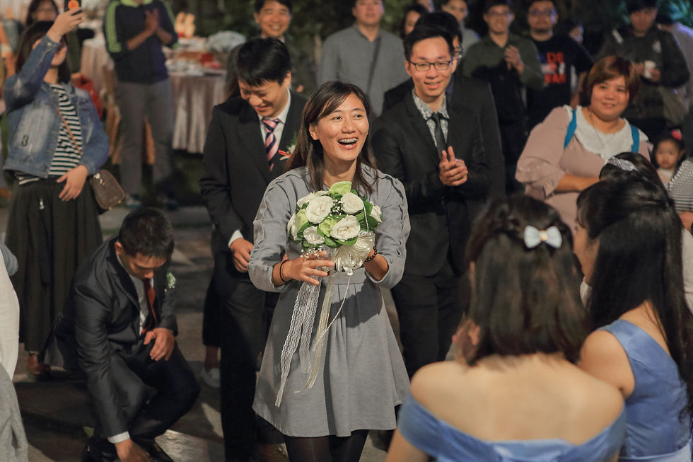 證婚儀式二人互唸誓詞,第一人視角拍攝的照片可以帶我們重回現場感受當下的感動。這場拍攝最令人挑戰的時刻也是從證婚儀式開始,室內室外不同的光線意味著色溫不同,拍攝前需要將所有補光設備設定好,尤其證婚儀式結束緊接著是戶外的丟捧花活動,這時太陽已經下山,戶外補光更加困難,兼顧色溫與光線同時協調的情況之下,當下利用多閃燈與色溫片將影像拍攝到最佳畫面。